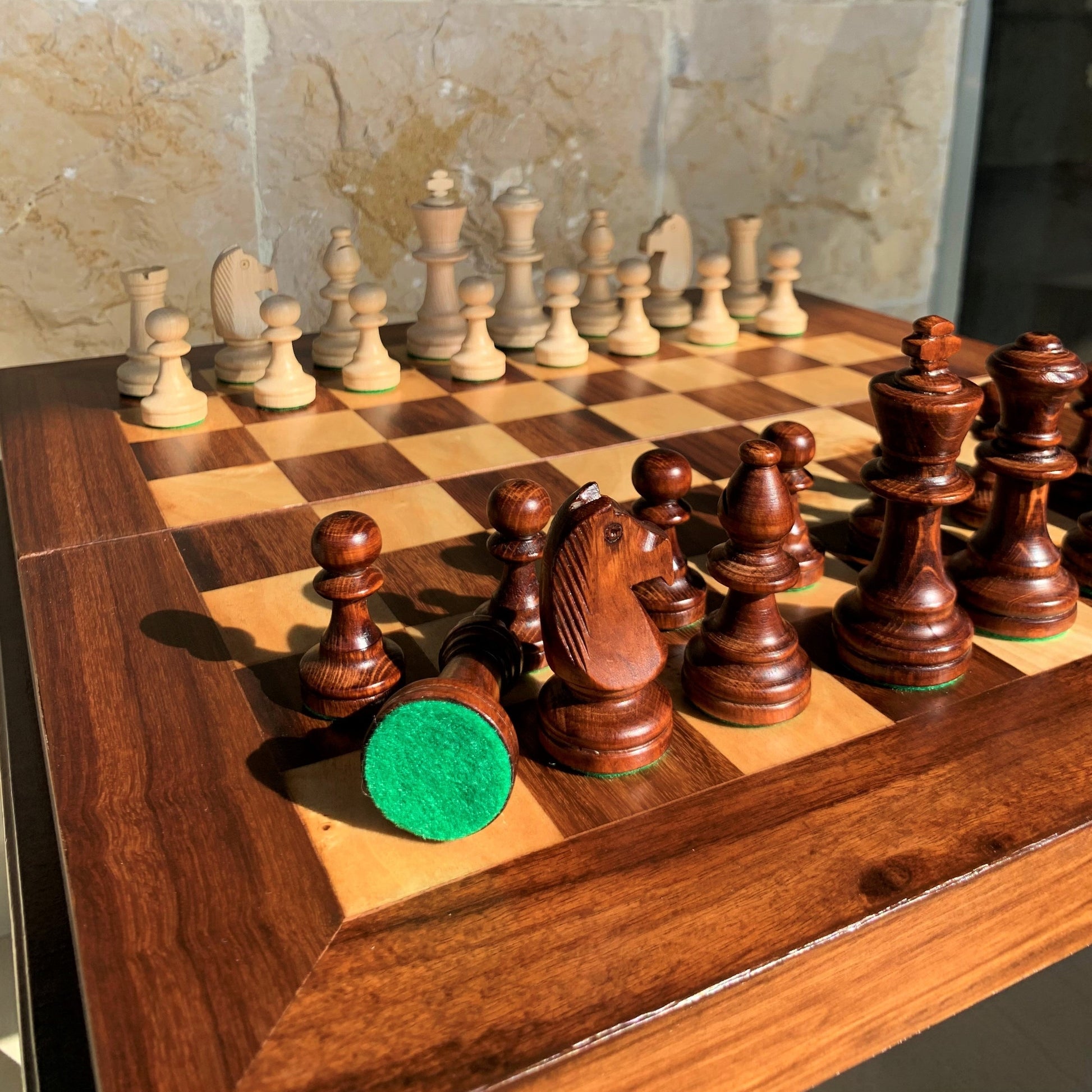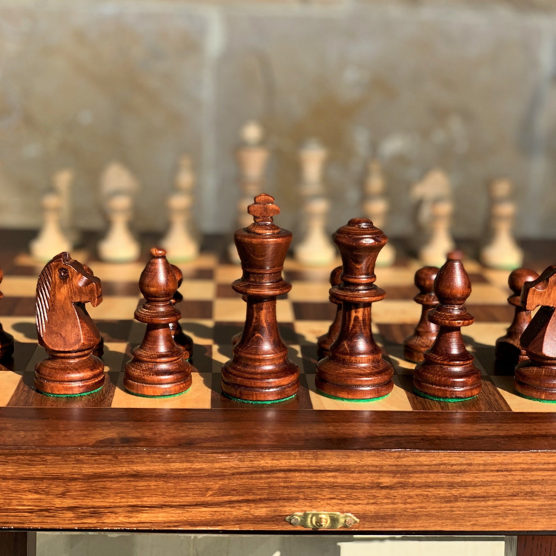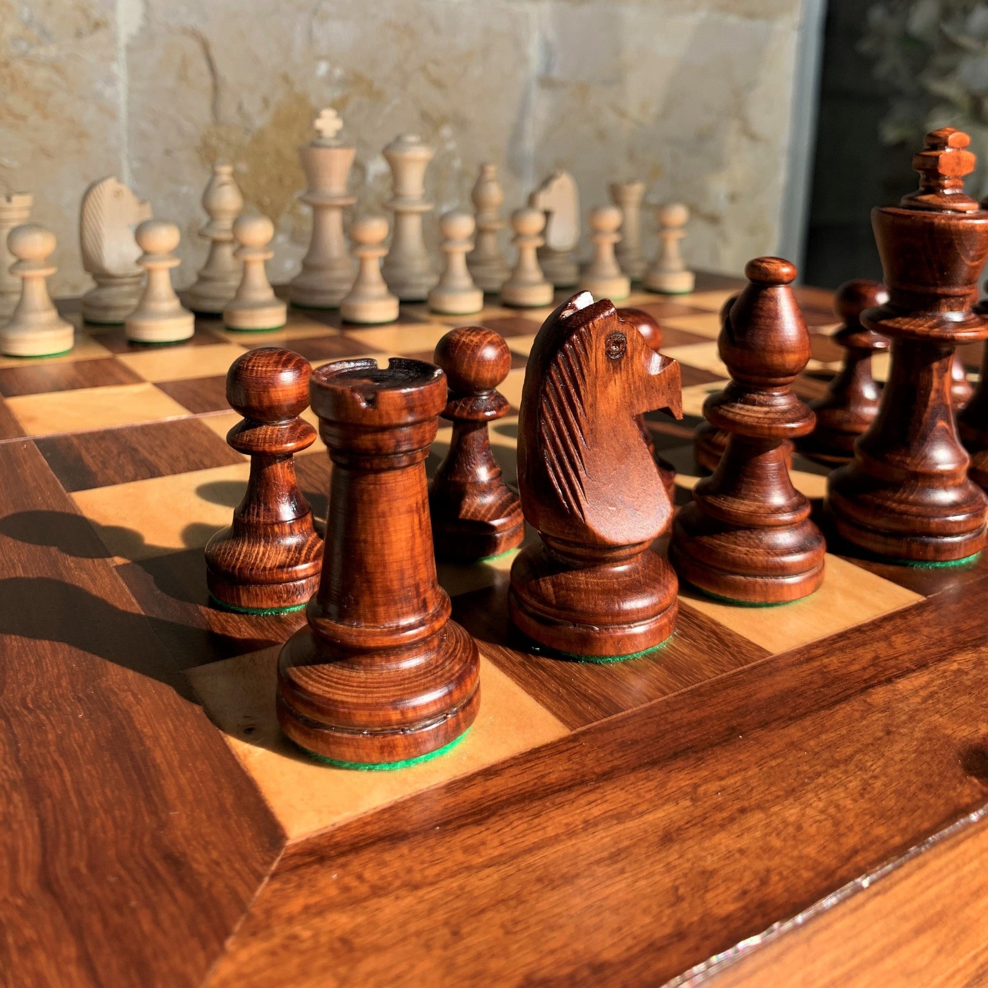 This solid chess set is a stunning work of art, handcrafted from luxurious Indian rosewood. The rich, dark tones of the wood are accentuated by a highly polished finish, giving the chess set a lustrous sheen that is sure to impress.