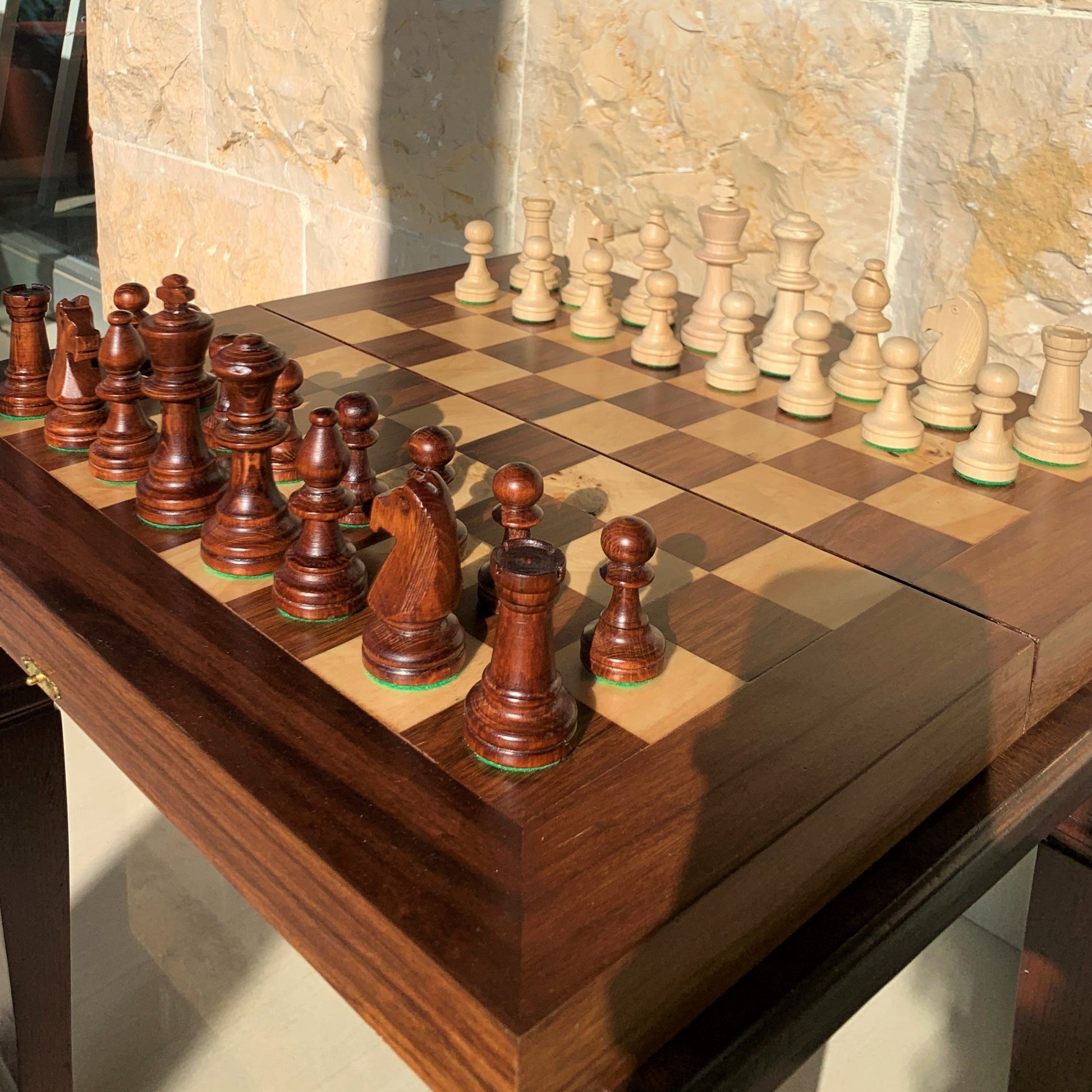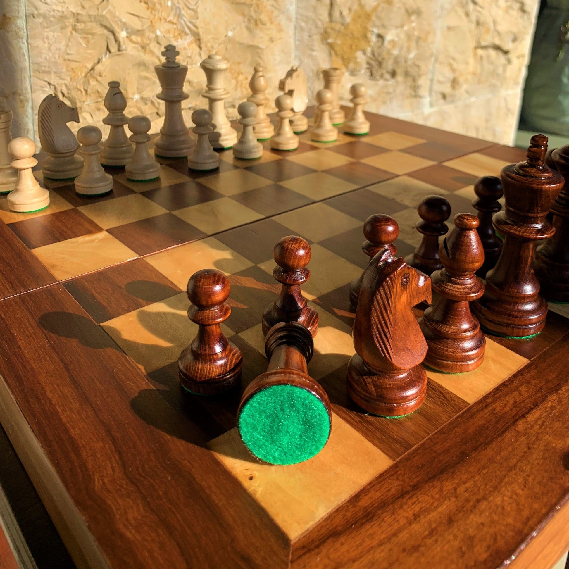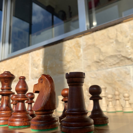 This solid chess set is a stunning work of art, handcrafted from luxurious Indian rosewood. The rich, dark tones of the wood are accentuated by a highly polished finish, giving the chess set a lustrous sheen that is sure to impress.