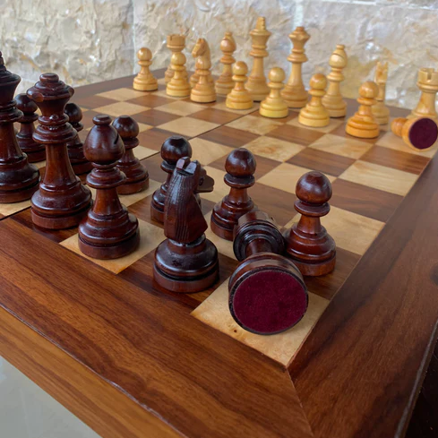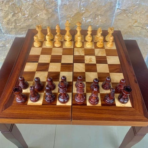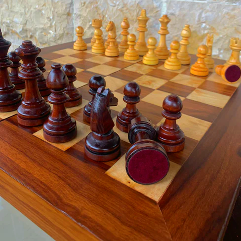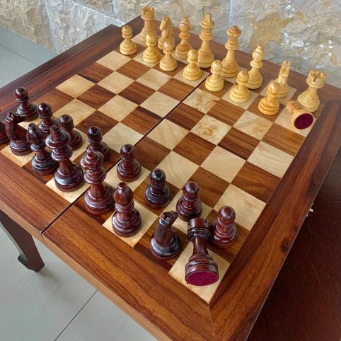 Experience the luxurious beauty of our handcrafted rosewood and Palissandre wood chess board, meticulously designed for an enhanced playing experience. The rich red-tinged finish, expertly cut from the finest Indian rosewood, exudes a sleek and elegant look that elevates any space.