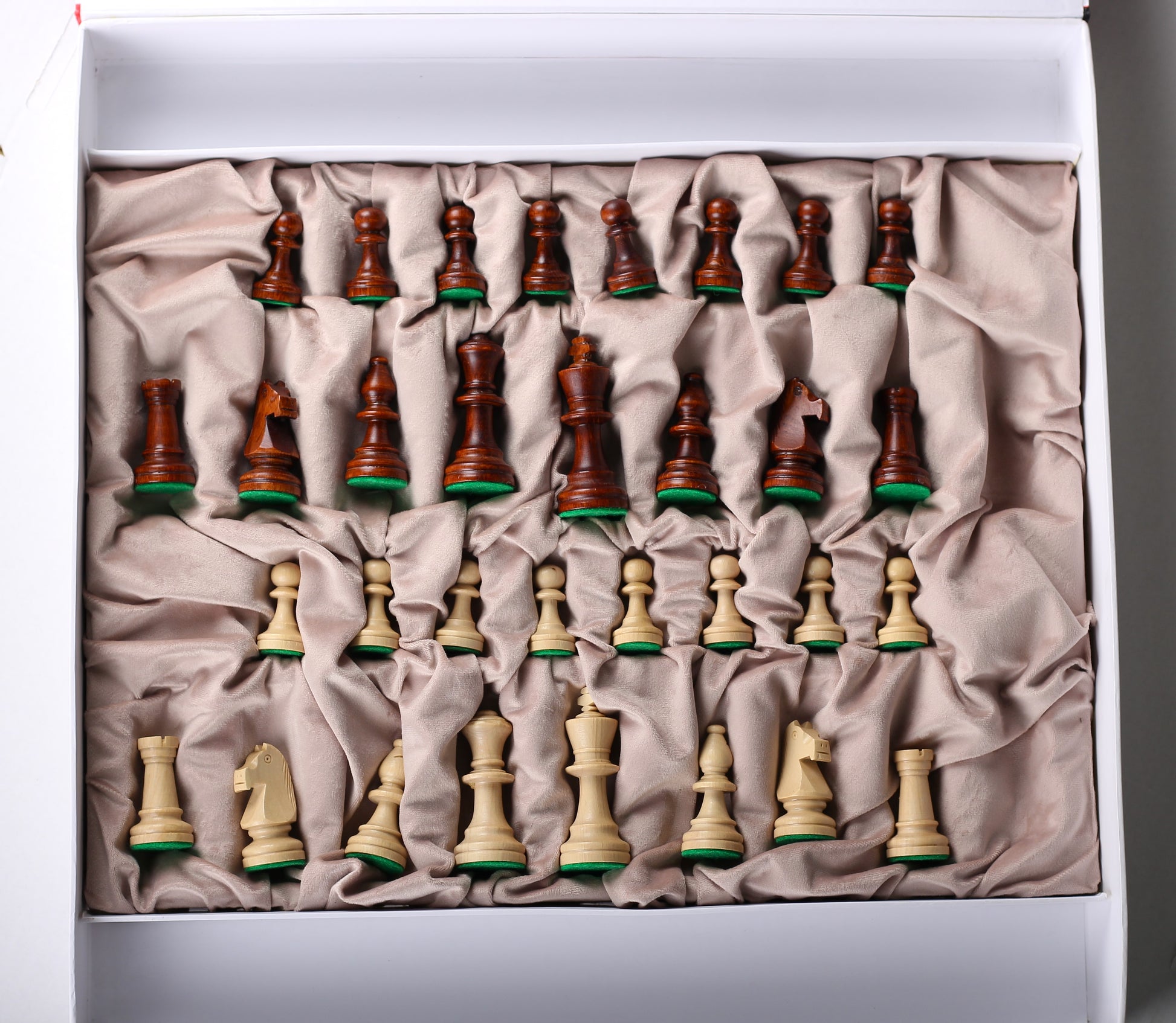 Adding allure, the pieces feature a shiny green velvet bottom, enhancing their regal appearance and providing optimal grip on the board. Hailing from Poland and renowned in Russian pro tournaments, these Polonais pieces offer a rich history and unparalleled quality.
