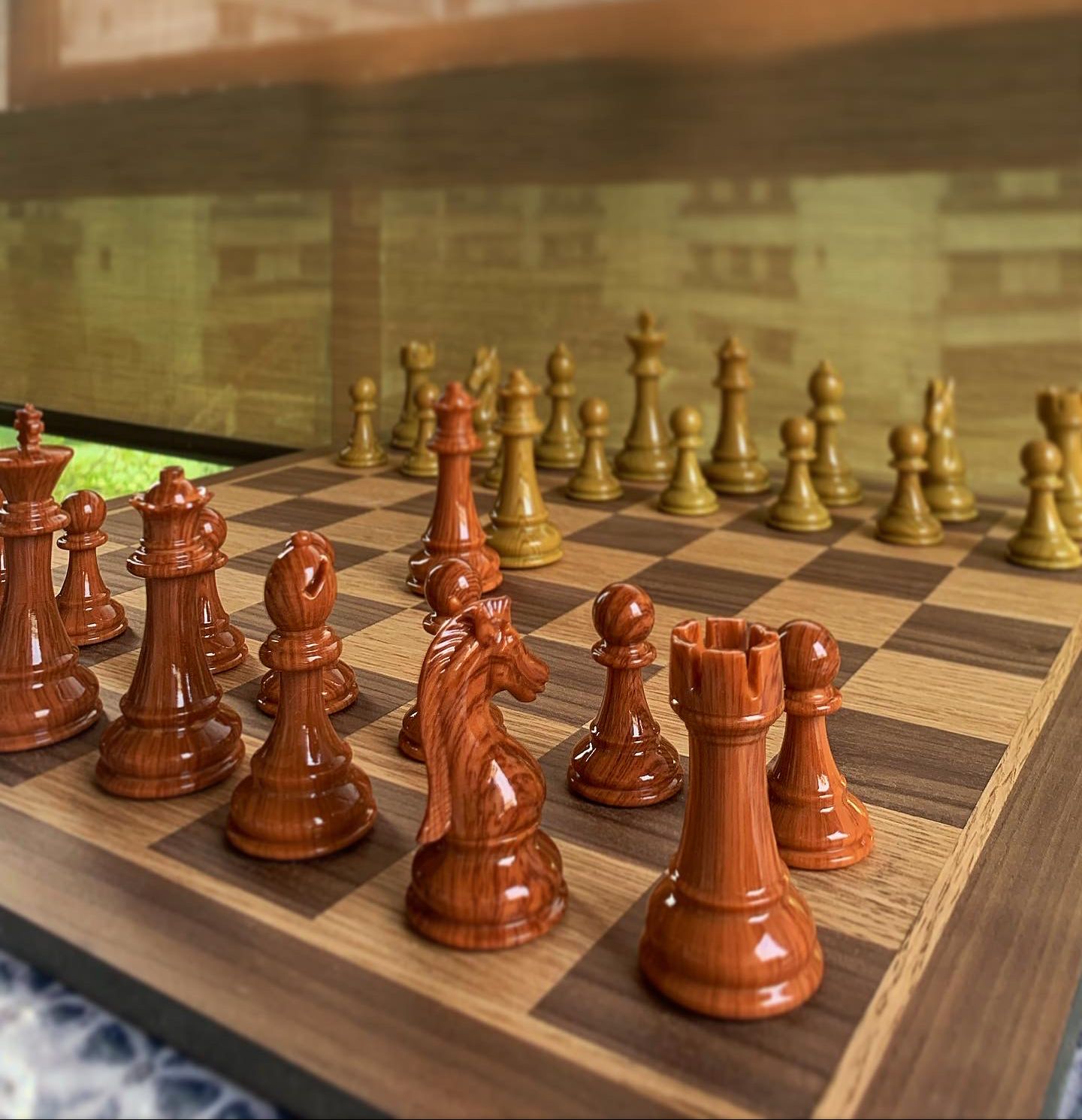 The set comes complete with triple weighted American Staunton Resin chess pieces, including extra queens to enhance your gameplay experience. These unique pieces have the appearance of finely crafted wooden pieces, but are actually made from bone, making them even more durable and weighty than traditional wooden chess pieces. The king measures an impressive 9.5cm, making it easy to spot on the board and adding to the overall elegance of the set.
