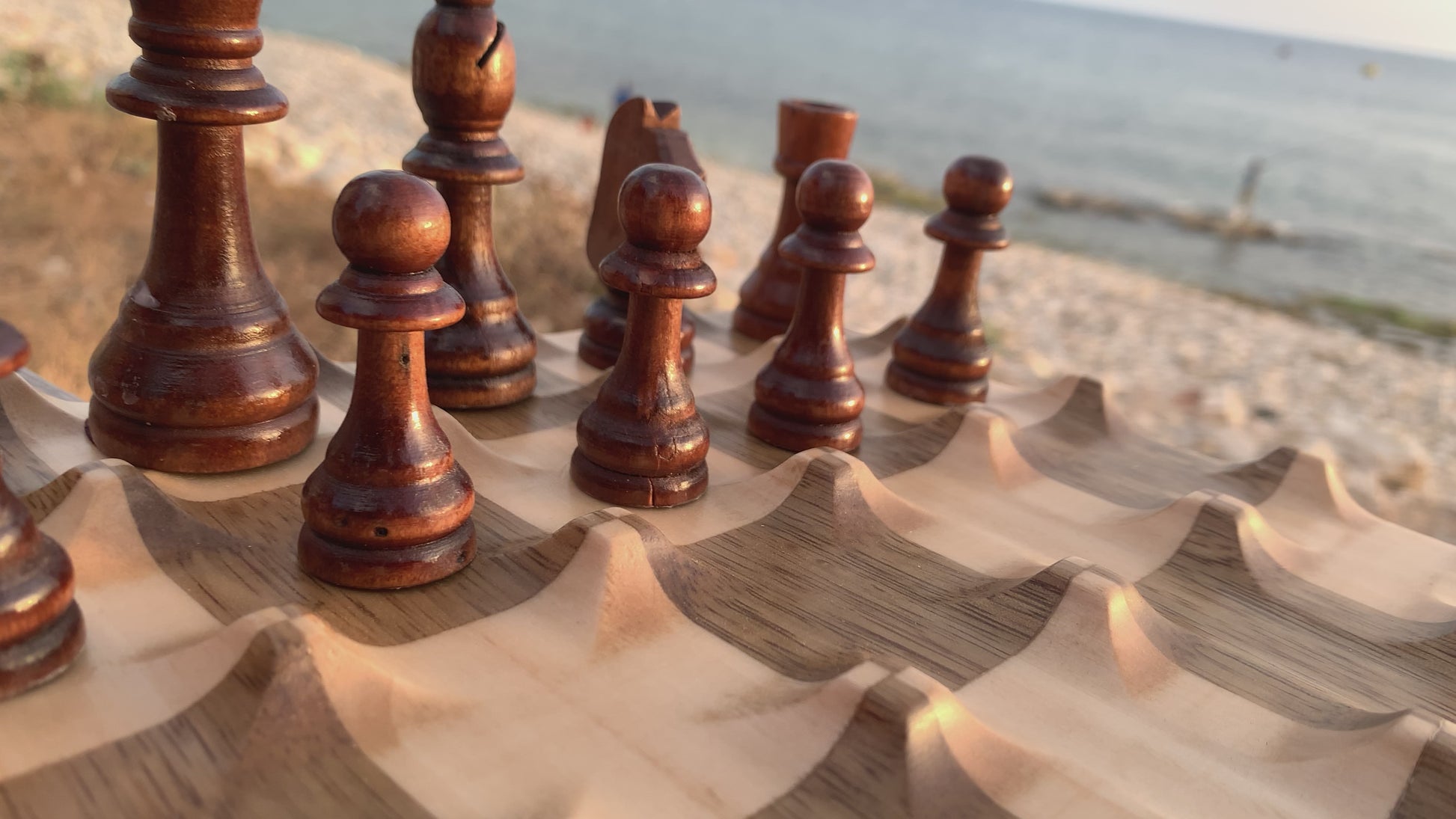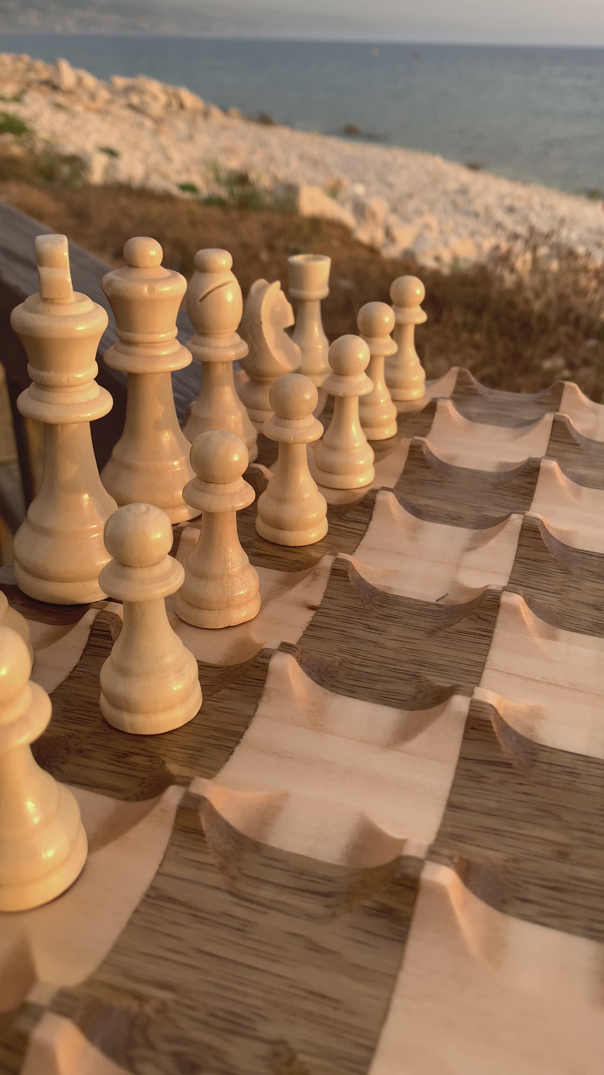 Introducing the captivating "Wavy" Wooden Chess Board, where artistry meets strategy in a mesmerizing fusion. Experience the thrill of the game on this unique board, where the waves of the chessboard transport you to a world of imagination and endless possibilities.